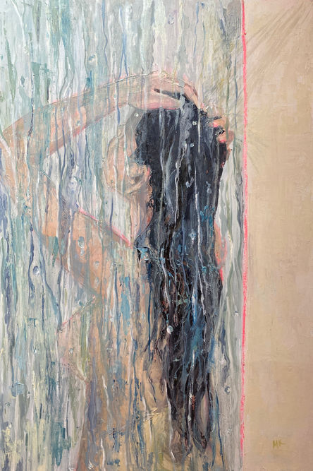 The shower is often viewed as the one place and time during which a person can get a break from the chaos of life. Standing under the stream, the calming properties of water and the white noise created by the water hitting the tile, seems to wash away worries, even for a short while. The shower is the one place to think of everything- or nothing. It is the one time during which there are no expectations of how to be or people to impress. There is the ability to disintegrate the struggles of the day, embrace the peace of the moment, and appreciate life. You can be vulnerable yet still feel safe, exposed but still private. The shower is the time when you can unapologetically break down but also build yourself back up. Shower is a five painting series which explores the meditative and healing properties of water as well as the emotional, mental, and physical benefits that come along with taking a shower.